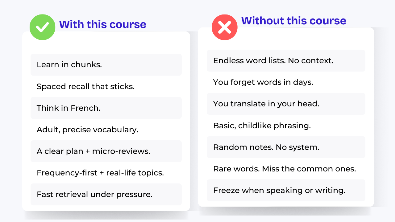 Your step-by-step system to build, activate, and retain adult-level French vocabulary.